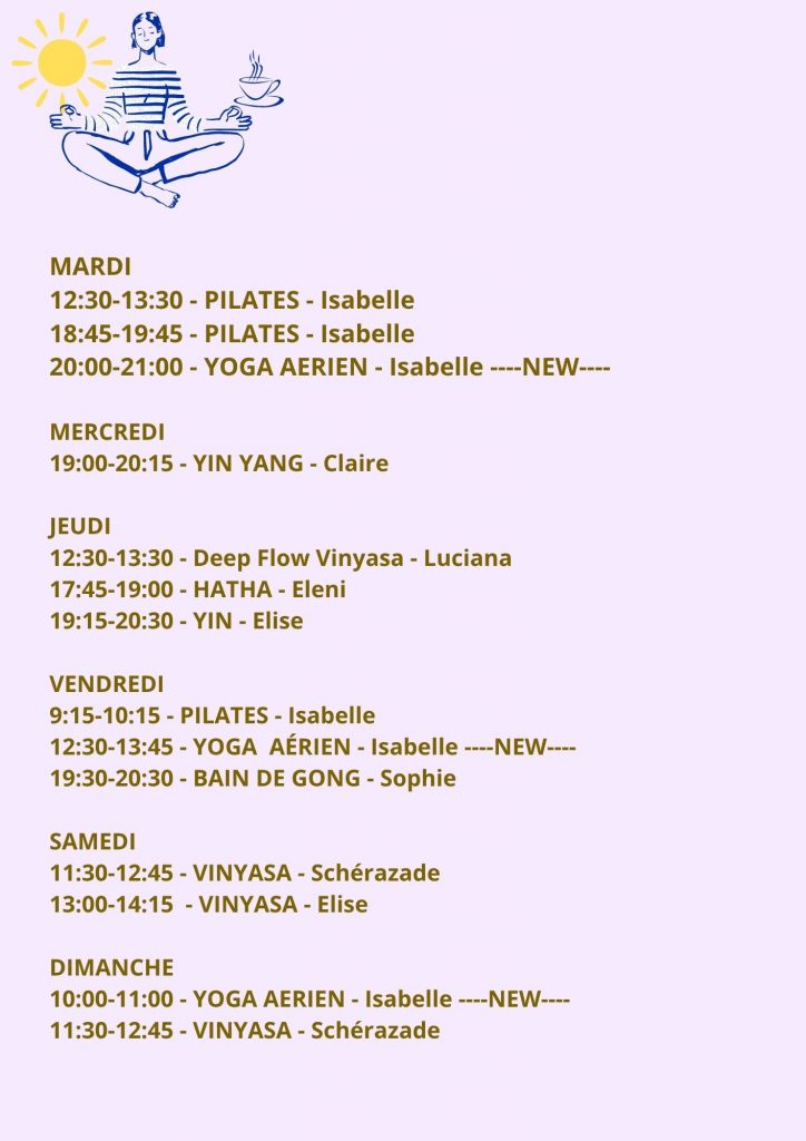 et samedis à 17:30-18:45 yoga aérien (dés le mois de séptembre 2025)